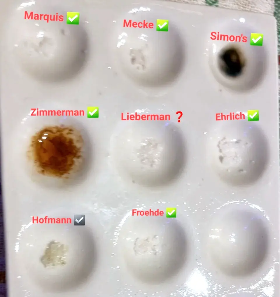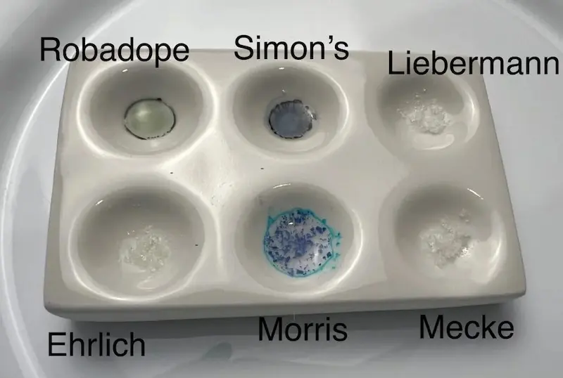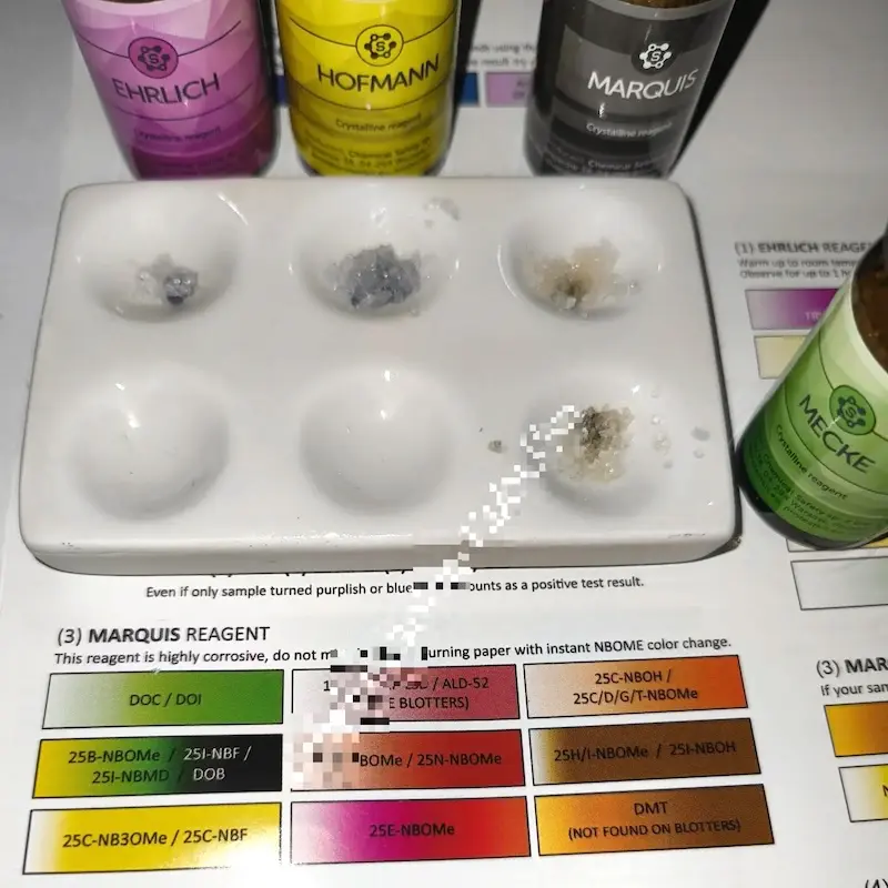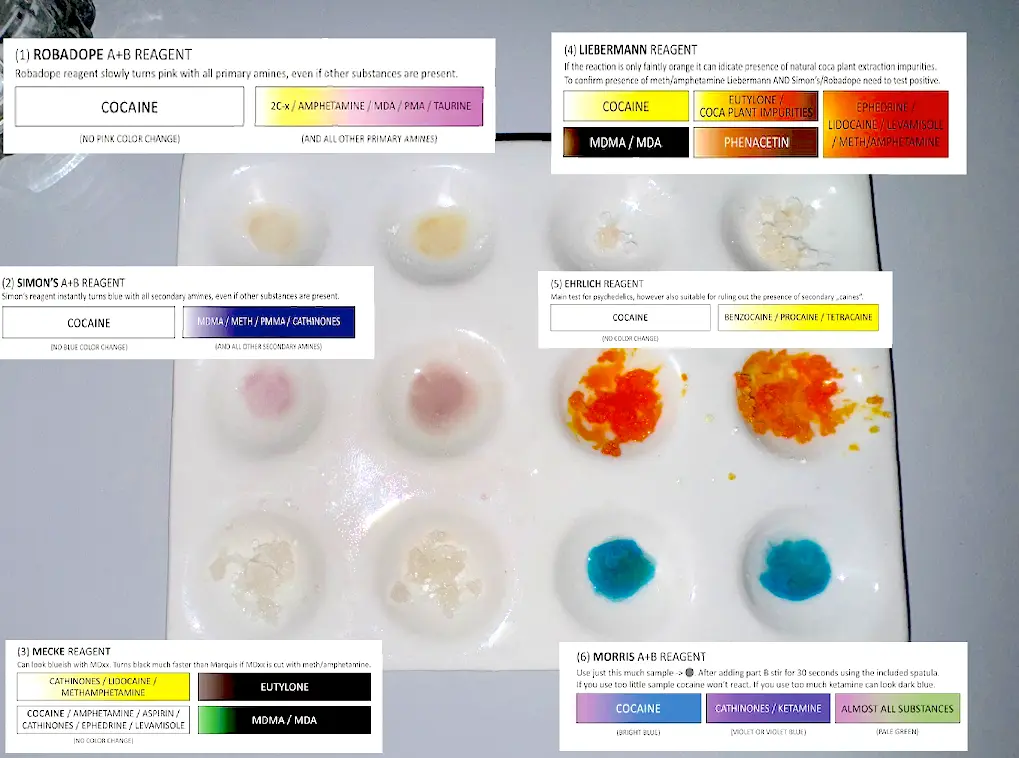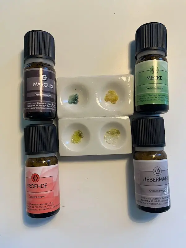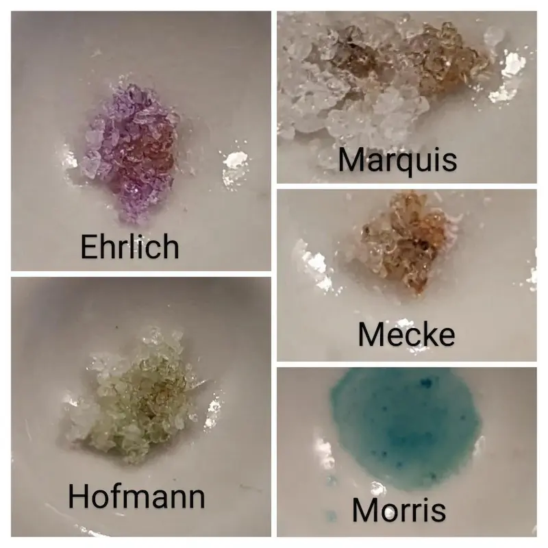 Nadesłane przez badaczy wyniki testów udostępniamy jako dodatek do naszych poradników, filmów i aplikacji. Wyniki będą się różnić w zależności od zanieczyszczenia próbki, ilości, oświetlenia, temperatury, ekspozycji na powietrze, przechowywania oraz jakości i degradacji reagentów. Zawsze używaj różnych testów aby zwiększyć precyzję. Pozytywny lub negatywny wynik nie oznacza, że substancja jest bezpieczna. Żadna substancja nie jest w 100% bezpieczna. Badaj substancje przed zażyciem. Sprawdź narkotest.